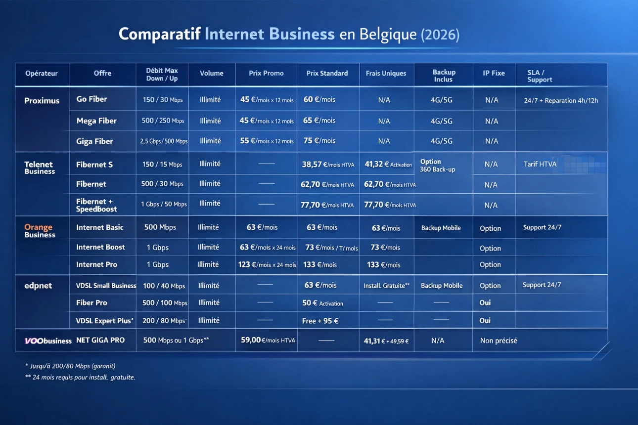 tableau comparatif 2026 (Belgique) – Internet fixe “Business / Indépendants / PME”