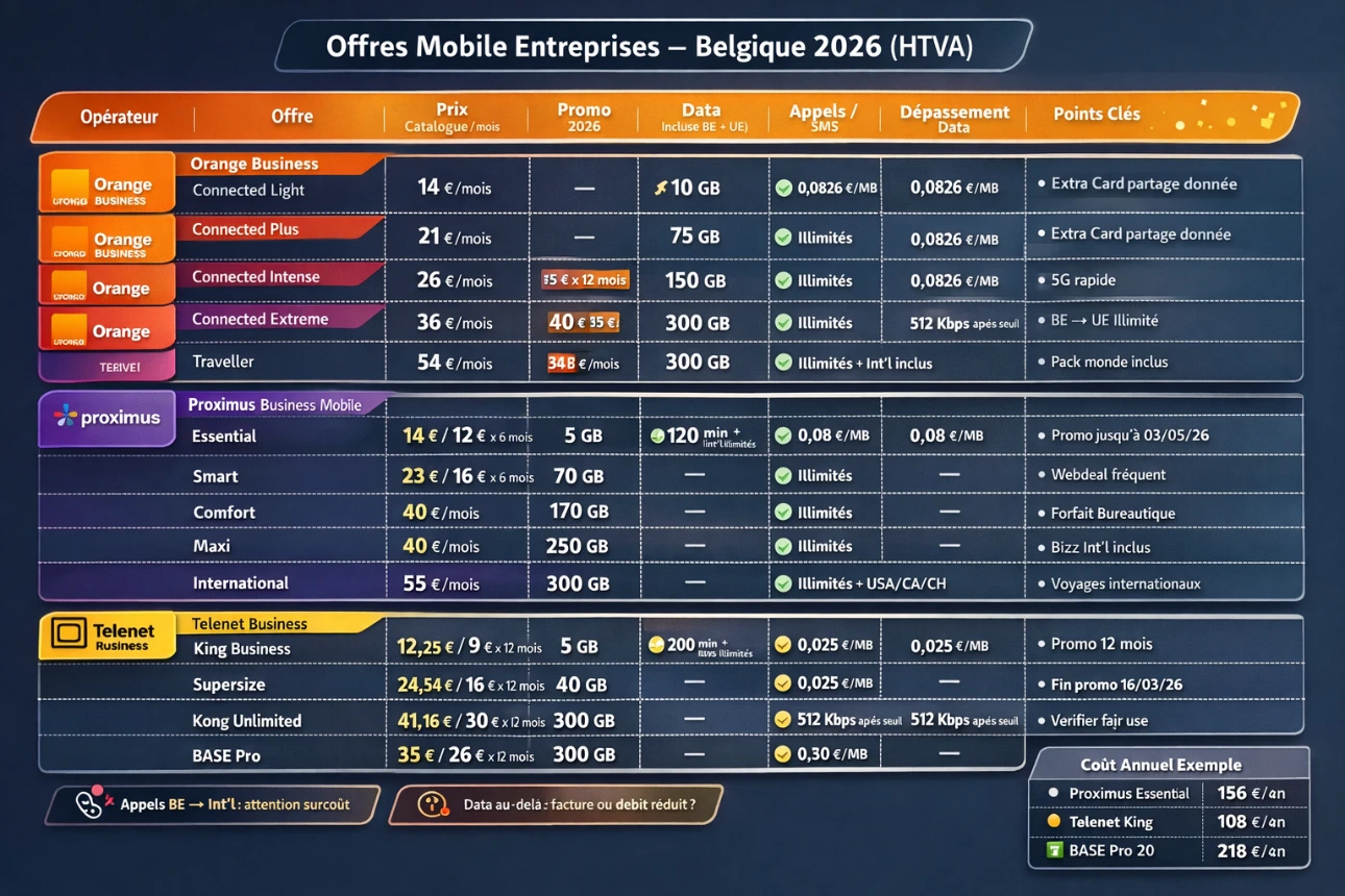 | Proximus (Mobile Connect) | Essential | 12,60 € | — | (plan Mobile Connect : volumes non sur extrait prix, mais offre entreprise) | — | — | Prix catalogue Mobile Connect (segment PME/entreprises) |