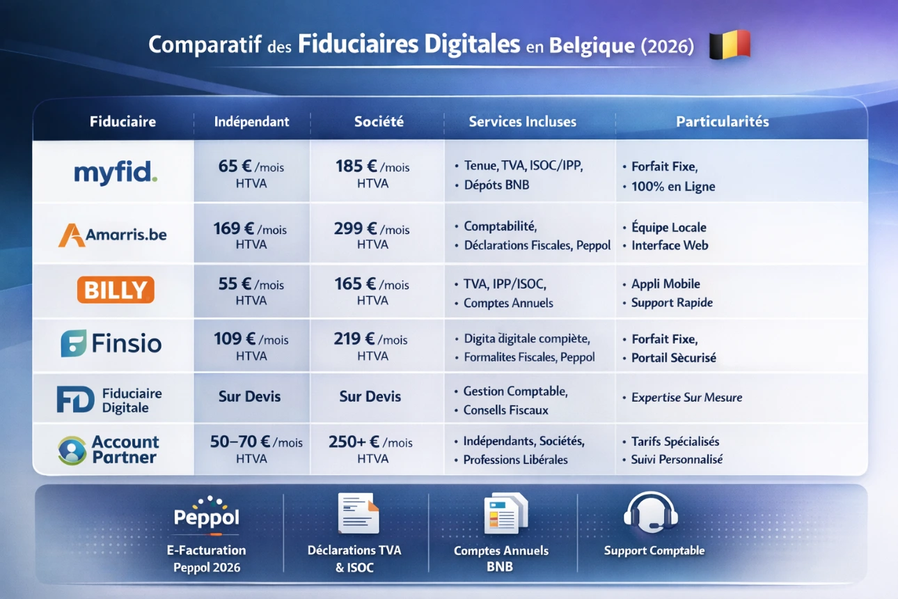 | Amarris.be | ~ €169 / mois HTVA | ~ €299 / mois HTVA | Interface web sécurisée + équipe comptable dédiée, facturation Peppol incluse. Prix publique 2026. |