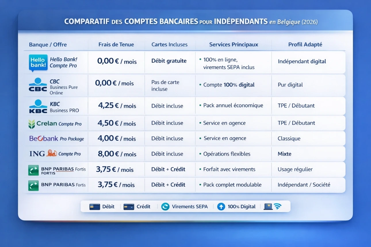 | Hello bank! – Compte Pro | Indépendants en personne physique | Gratuit | Carte de débit gratuite | Opérations électroniques en euros gratuites | (non détaillé sur l’extrait) | (cash selon canaux BNP/Hello) | Limité au statut personne physique (pas SRL). (pro.hellobank.be) |