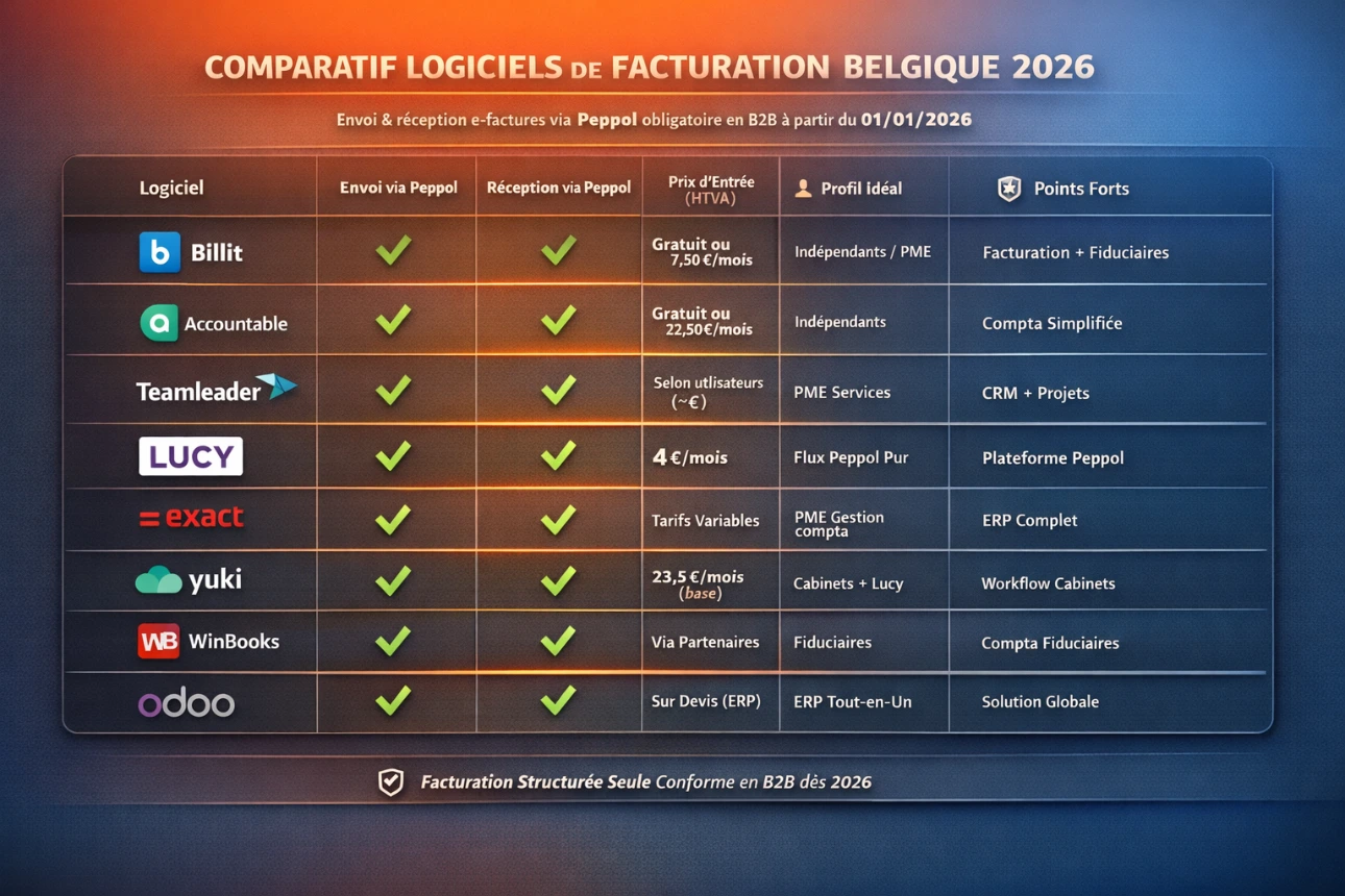 | Sage (Belux) | Sage communique sur la conformité e-facturation 2026 | Idem : “envoyer et recevoir” à partir de 2026 | Variable selon produit Sage | Packs / offres | PME déjà en Sage | Éditeur installé + accompagnement | Il faut identifier le produit Sage exact utilisé pour juger le Peppol concret |