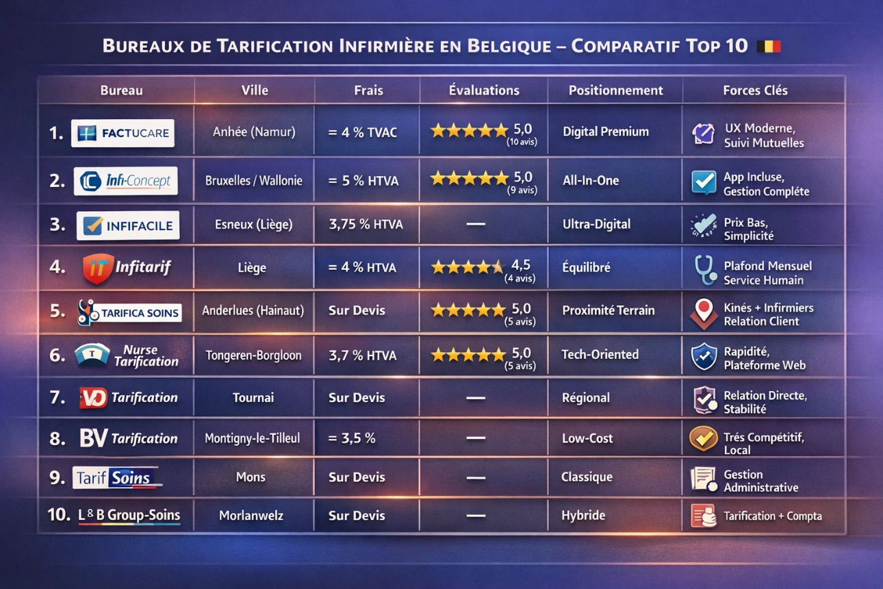 | 1 | Factucare | Anhée (Namur) | ≈ 4 % TVAC | ⭐️ 5,0 / 5 (10 avis) | Très bons avis publics |