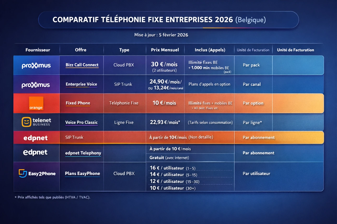 comparatif “2026” (Belgique) des abonnements de téléphonie fixe pour entreprises que l’on peut comparer de manière chiffrée et vérifiable en ligne (prix publics + conditions lisibles), au 5 février 2026.