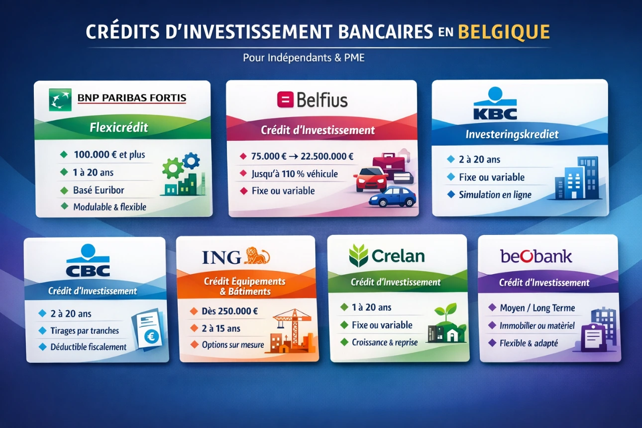 | Belfius | Belfius Business Credit (petits montants) | jusque 75.000 € | — | — | décision rapide, véhicule jusqu’à 110% (Belfius Banque) |