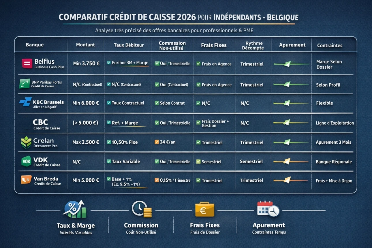 | Banque Van Breda – Crédit de caisse | Indépendants / professions libérales (cœur de cible) | min. 5.000 € | Taux de base (ex. 9,5%) + 1% (doc info) | Oui : provision de mise à disposition 0,15% / trimestre sur le crédit accordé | Frais dossier 600 à 1.250 € | Intérêts payables trimestriellement | Très lisible sur la structure de coûts (dossier + mise à dispo) |